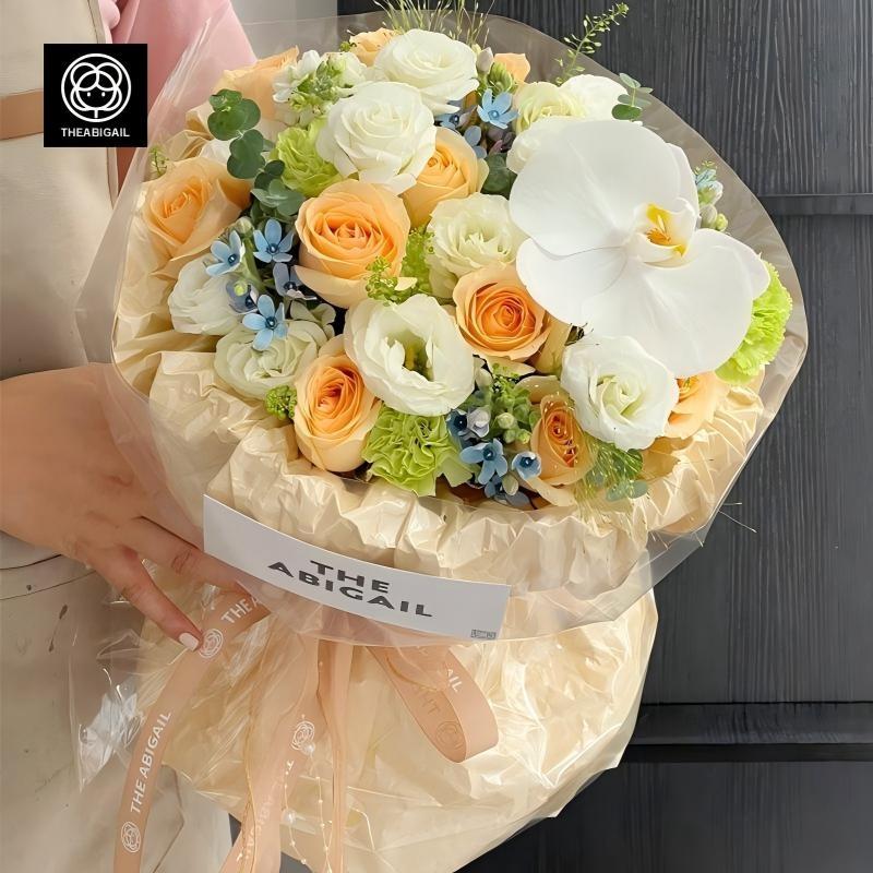 蝴蝶蘭,香檳色玫瑰,白色玫瑰,白色桔梗,時令配花