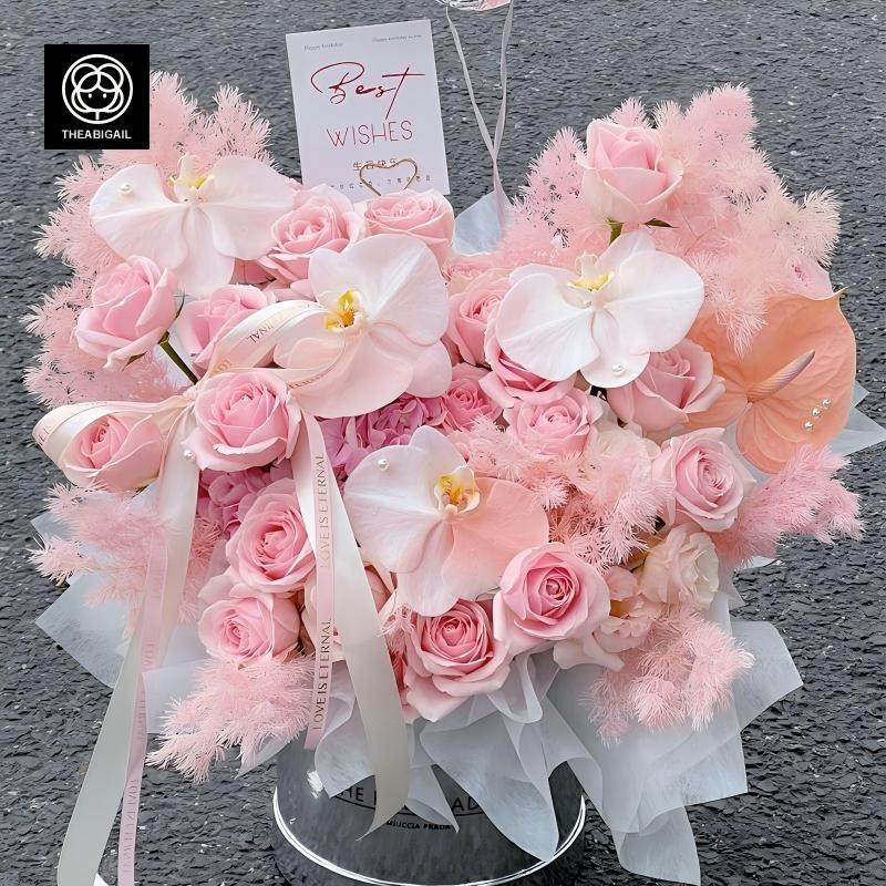繡球,蝴蝶蘭,粉色玫瑰,紅掌(噴色),時令配花