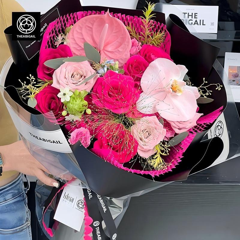 蝴蝶蘭(噴色),粉色玫瑰,佛洛依德玫瑰,多頭玫瑰,紅掌(噴色),時令配花