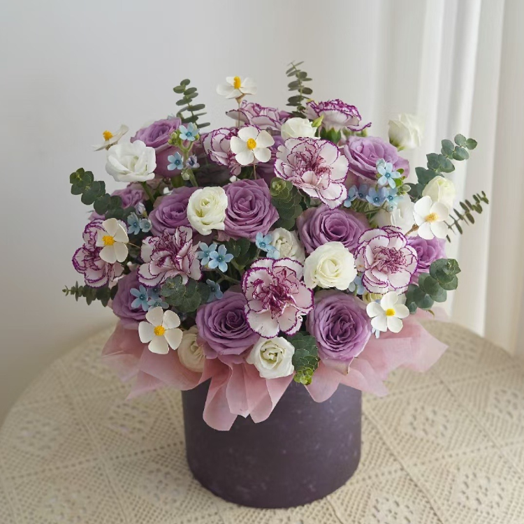 紫色玫瑰,白色桔梗,康乃馨,藍星花,時令配花