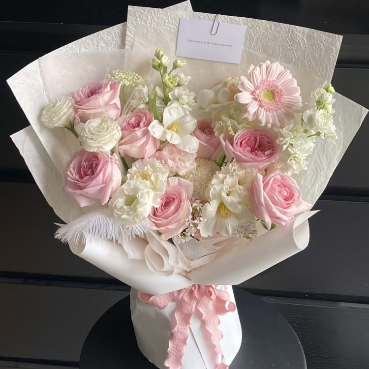 鬱金香,白色桔梗,粉色玫瑰,乒乓菊,非洲菊,白色紫羅蘭,時令配花