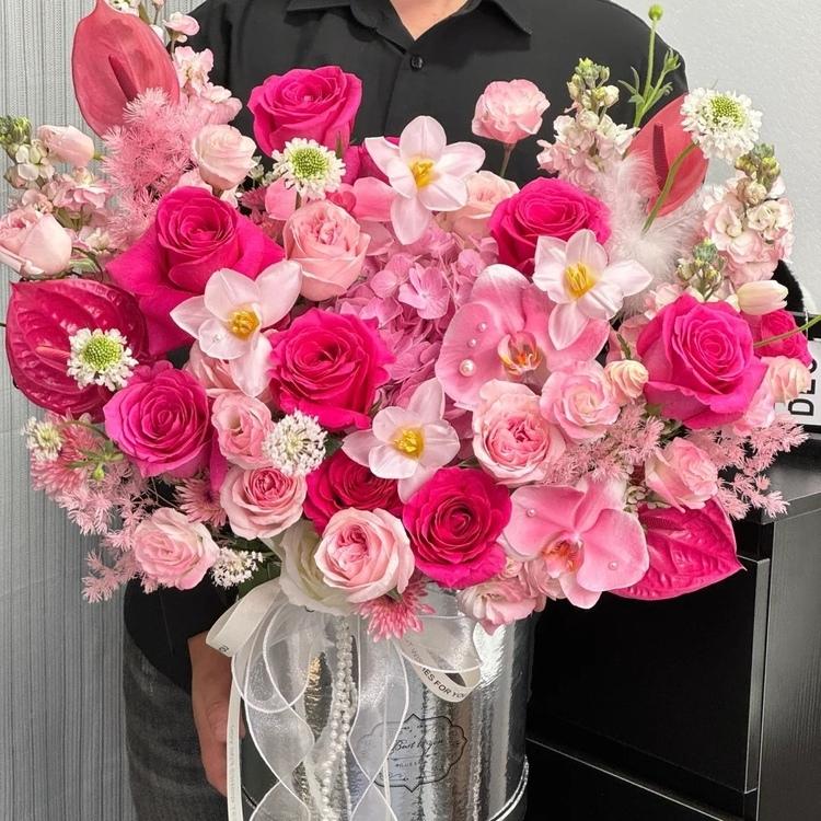 佛洛德玫瑰、鬱金香、蝴蝶蘭、桔梗、繡球、時令配花