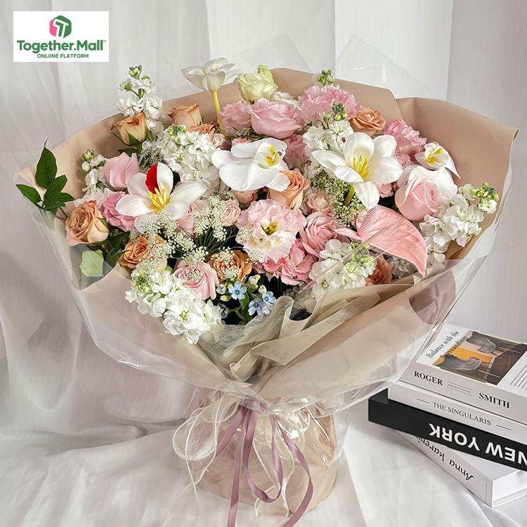 蝴蝶蘭,鬱金香,粉色玫瑰,卡布奇洛玫瑰,桔梗(噴色),紅掌(噴色),時令配花
