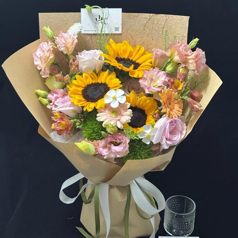向日葵,非洲菊,粉色玫瑰,桔梗,時令配花