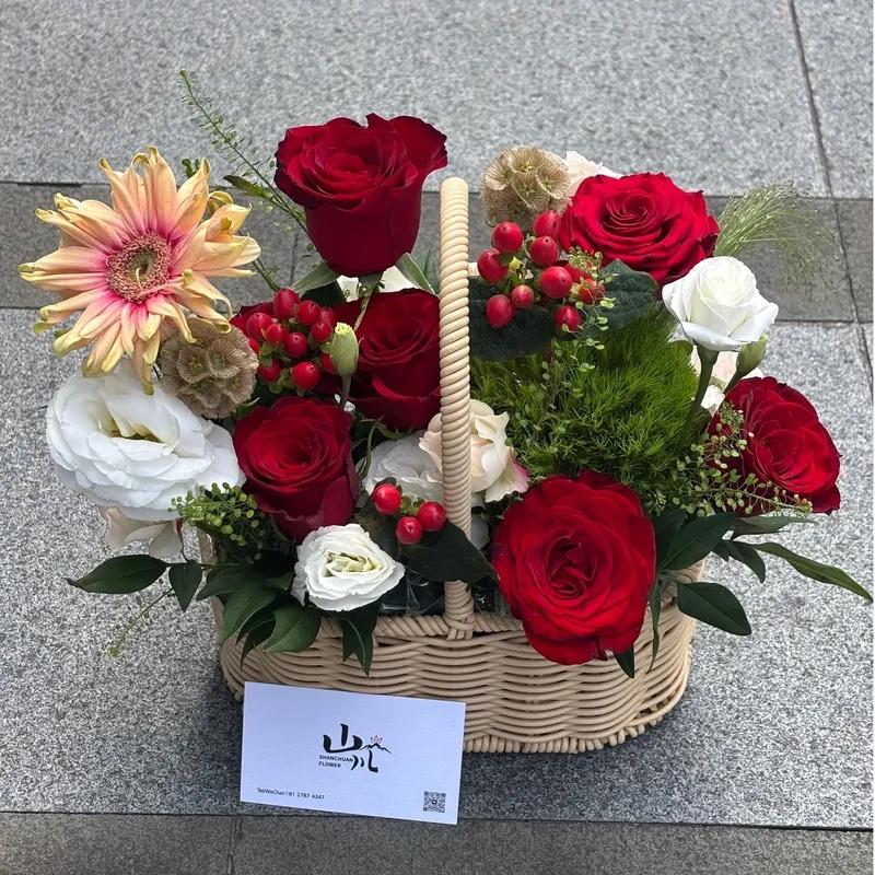 紅色玫瑰,拉絲非洲菊,白色桔梗,時令配花