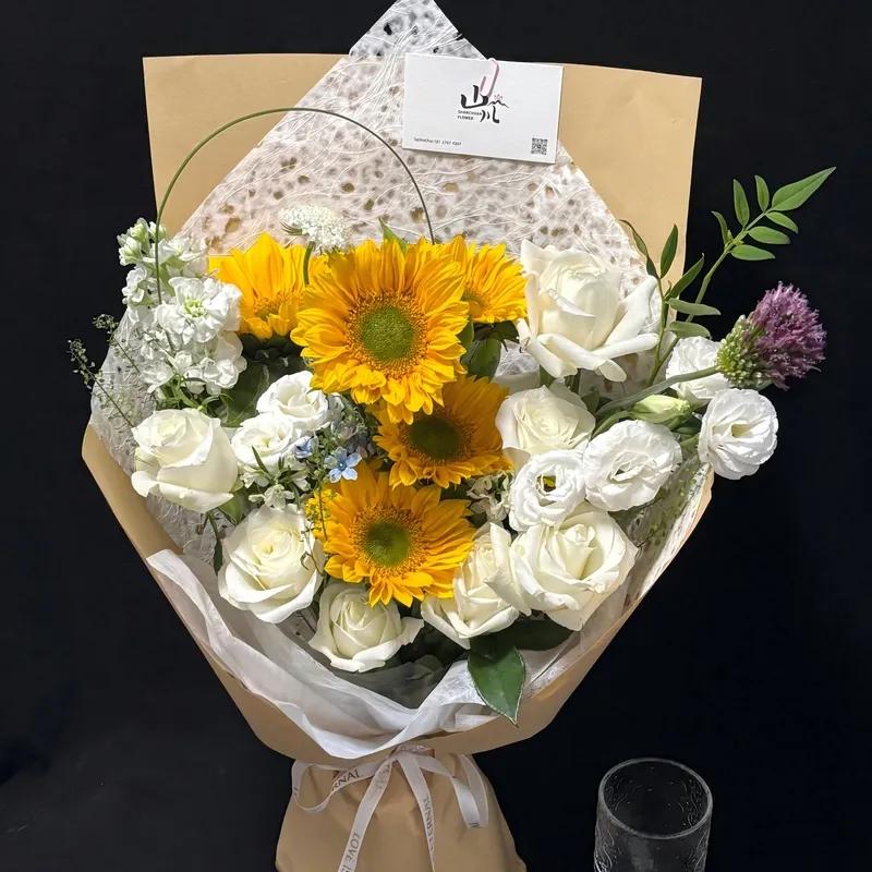 向日葵,白色玫瑰,白色桔梗,時令配花
