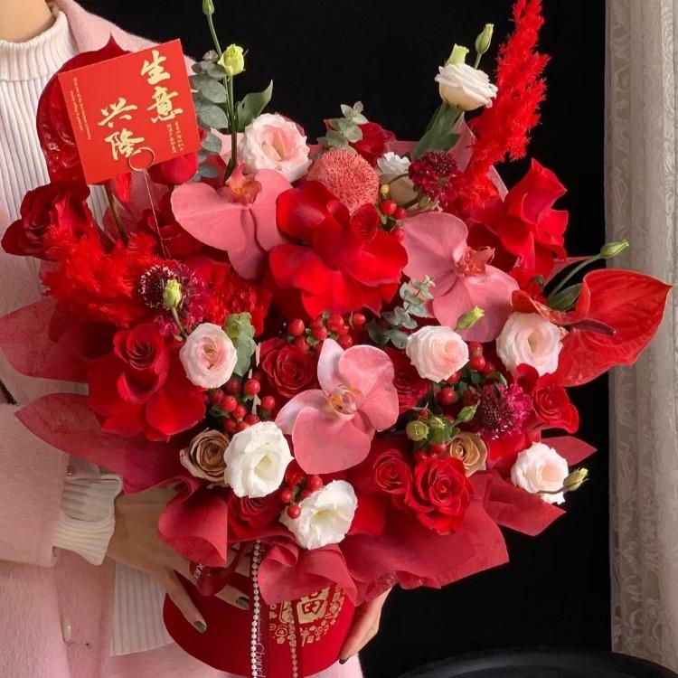 紅色玫瑰,蝴蝶蘭,乒乓菊,紅掌,洋桔梗,時令配花