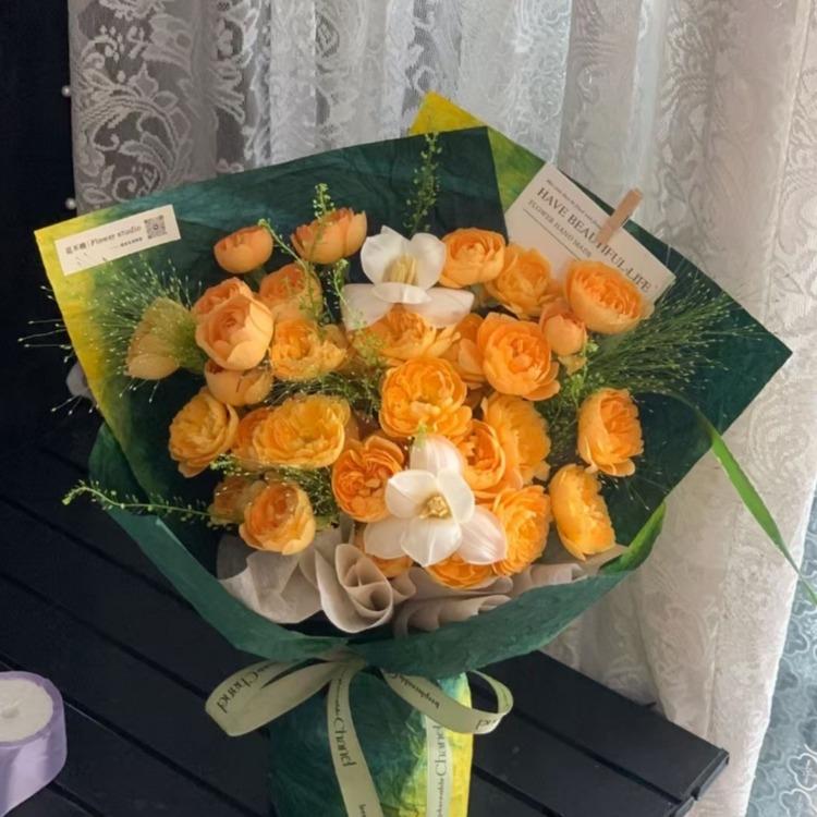 橙芭比多頭玫瑰,鬱金香,時令配花