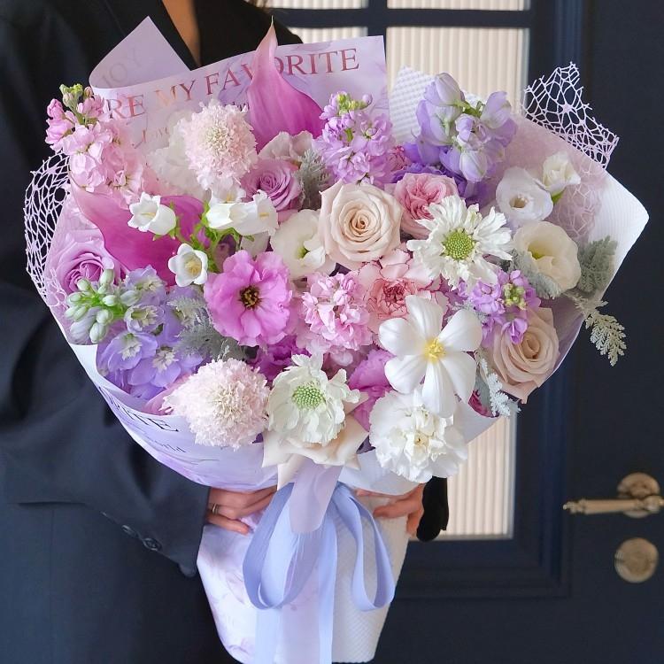 鬱金香,曼塔玫瑰,非洲菊,紫羅蘭,白色桔梗,康乃馨,時令配花