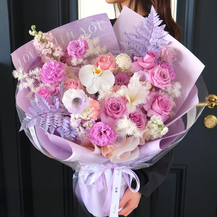 蝴蝶蘭,鬱金香,粉色玫瑰,紫色玫瑰,桔梗,紫羅蘭,時令配花