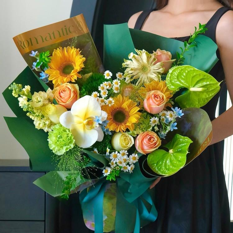 向日葵,蝴蝶蘭,拉絲非洲菊,香檳玫瑰,康乃馨,紫羅蘭,紅掌(噴色),時令配花