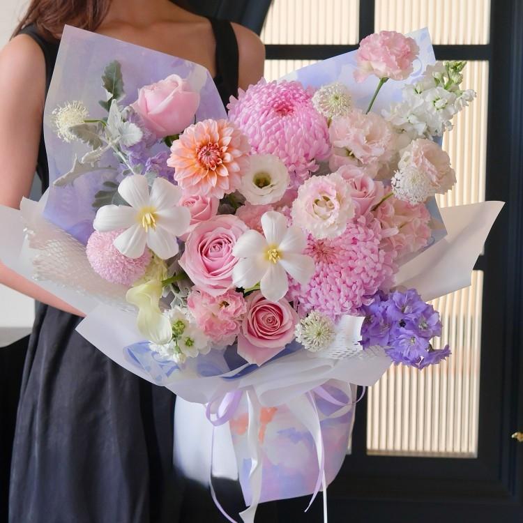 鬱金香,大麗花,牡丹菊,乒乓菊,粉色玫瑰,康乃馨,紫羅蘭,時令配花