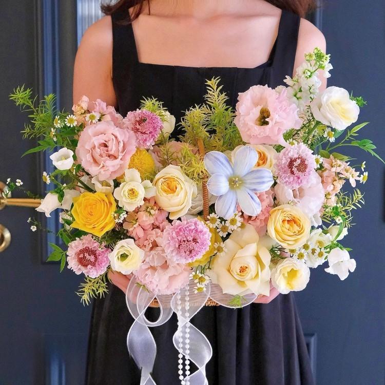 鬱金香,奶油杯玫瑰,香檳玫瑰,黃色玫瑰,康乃馨,白色桔梗,紫羅蘭,時令配花