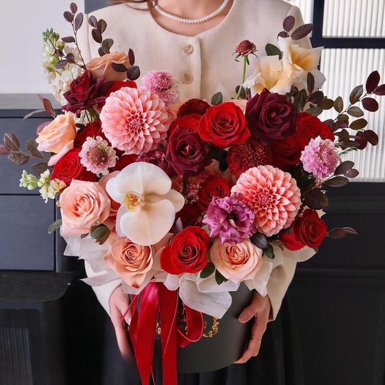 蝴蝶蘭,大麗花,紅色玫瑰,卡布奇洛玫瑰,時令配花