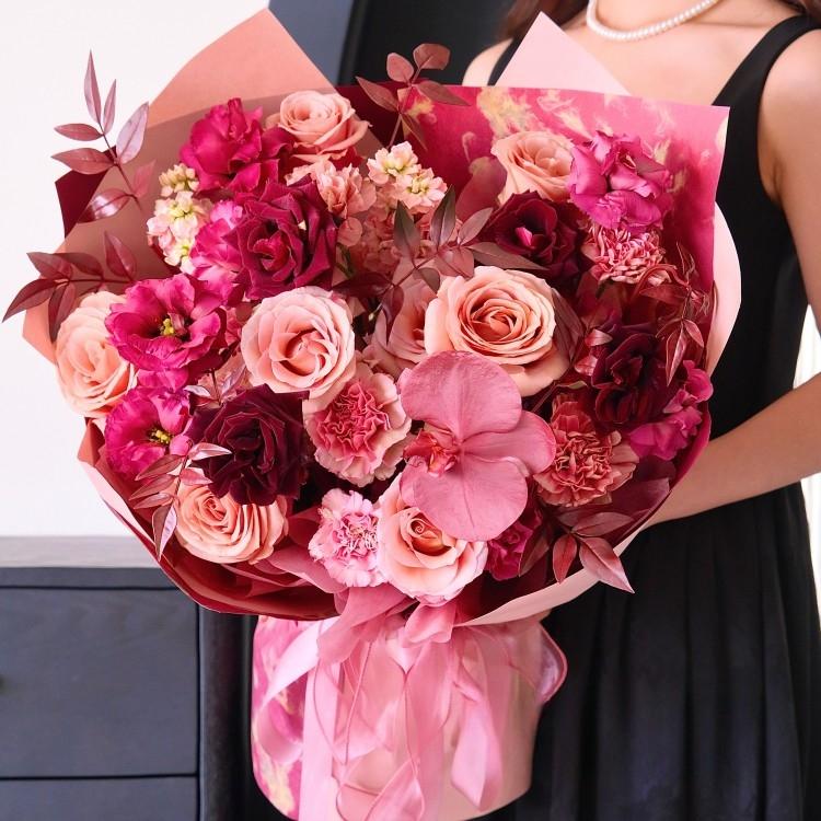 蝴蝶蘭,卡布奇洛玫瑰,紅色玫瑰,桔梗,康乃馨,時令配花