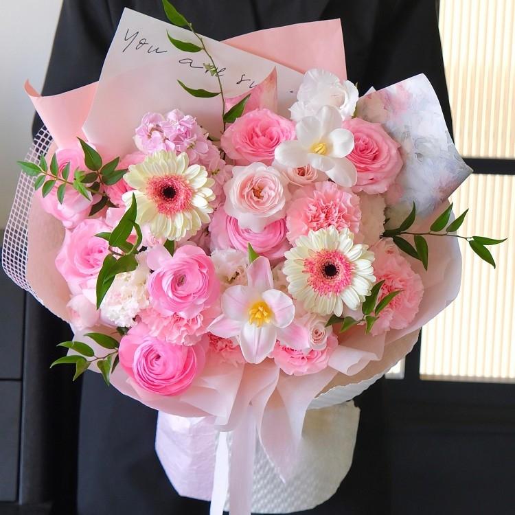 鬱金香,非洲菊,粉色玫瑰,康乃馨,紫羅蘭,時令配花