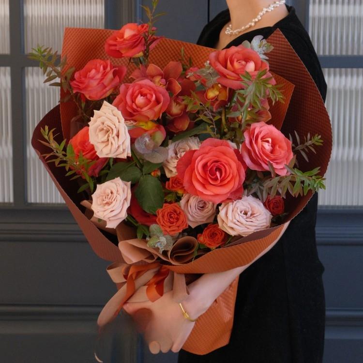 紅色玫瑰,曼塔玫瑰,橙色多頭玫瑰,時令配花