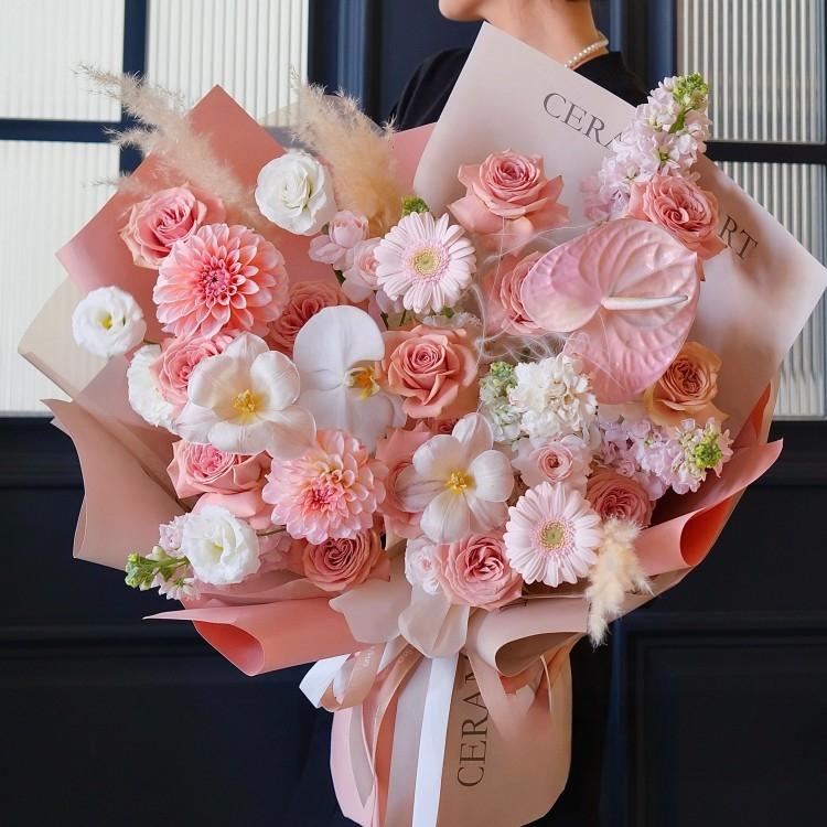 蝴蝶蘭,大麗花,鬱金香,粉色玫瑰,非洲菊,紫羅蘭,紅掌(噴色),時令配花