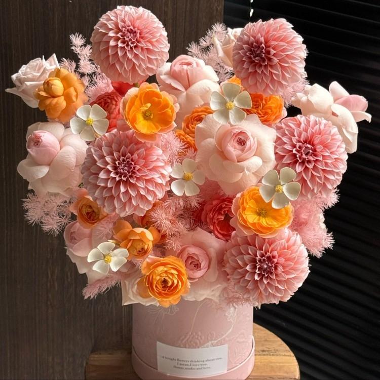 Dahlias, pink roses, orange roses, seasonal flowers
