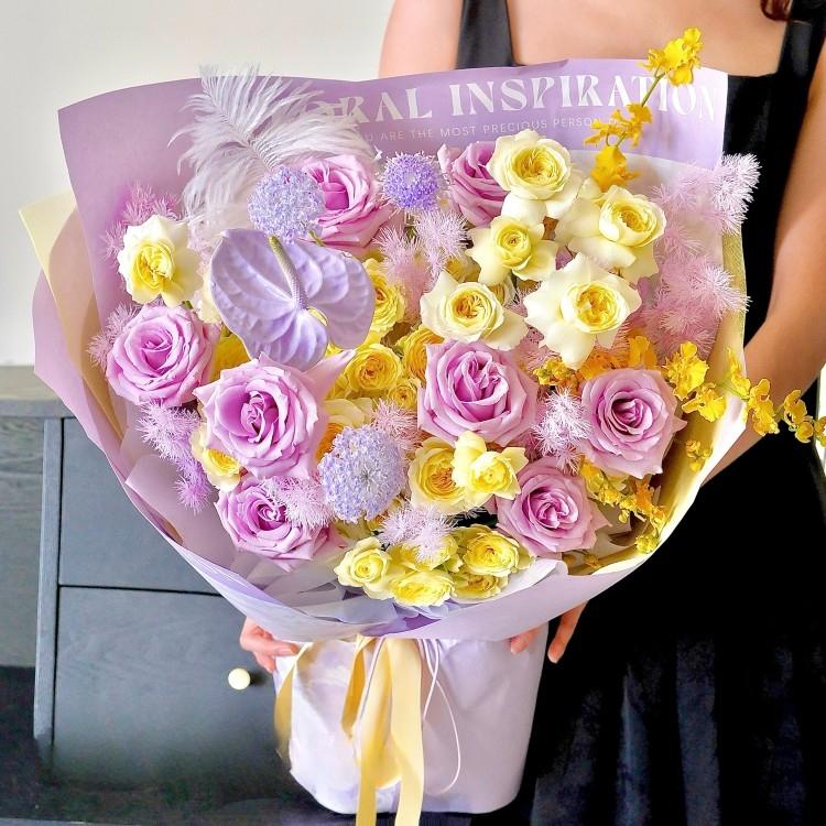 奶油杯玫瑰,紫色玫瑰,紅掌(噴色),時令配花