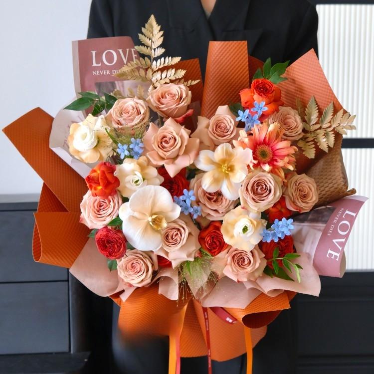 蝴蝶蘭,鬱金香,拉絲非洲菊,曼塔玫瑰,多頭玫瑰,時令配花