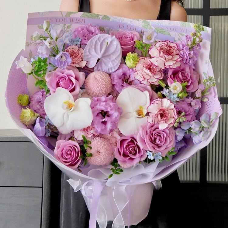蝴蝶蘭,乒乓菊,紫色玫瑰,康乃馨,桔梗,紅掌(噴色),時令配花