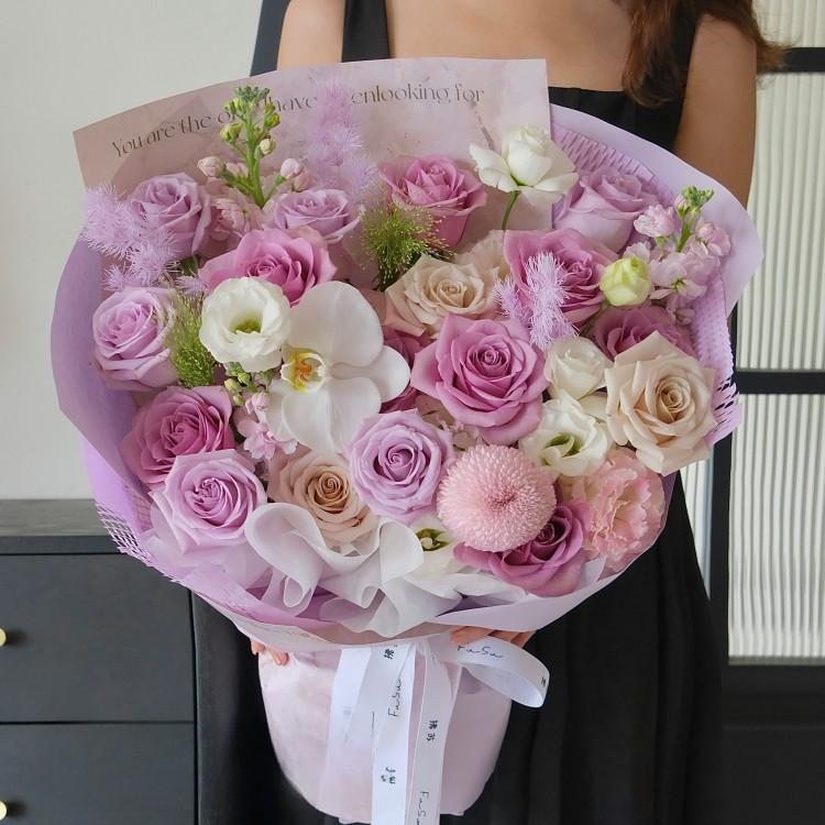 蝴蝶蘭,乒乓菊,曼塔玫瑰,紫色玫瑰,白色桔梗,時令配花