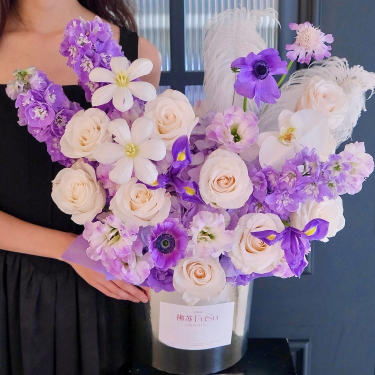 鬱金香,蝴蝶蘭,白色玫瑰,桔梗,藍盆花,時令配花
