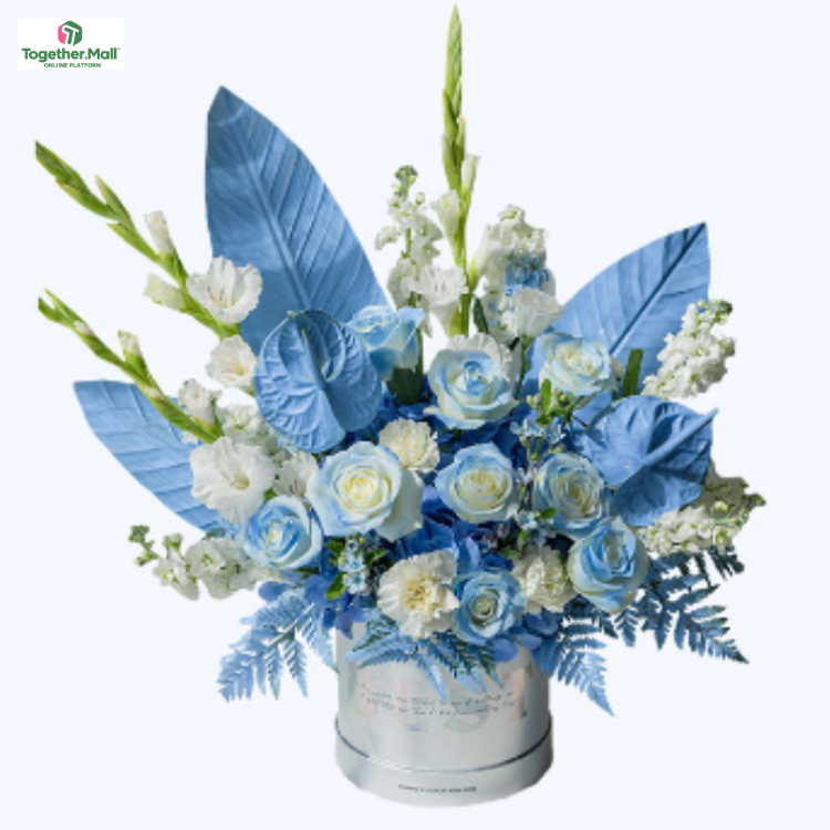 碎冰蓝玫瑰(喷色),桔梗(喷色),红掌(喷色),紫罗兰,时令配花