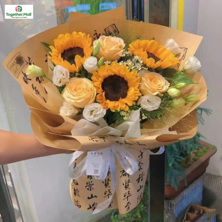 向日葵、香檳玫瑰、白桔梗、時令配花