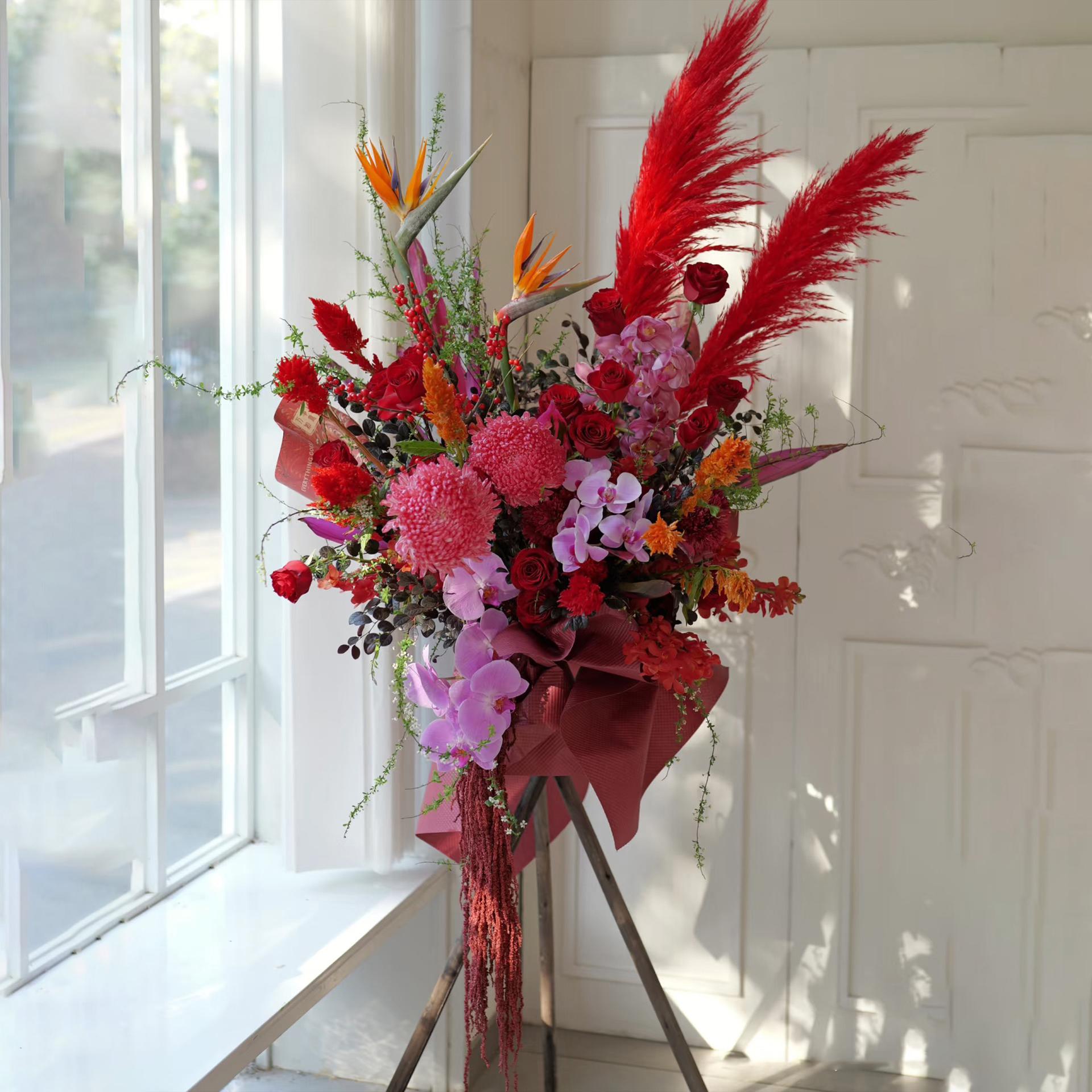 蝴蝶兰,红色玫瑰,牡丹菊,天堂鸟,时令配花