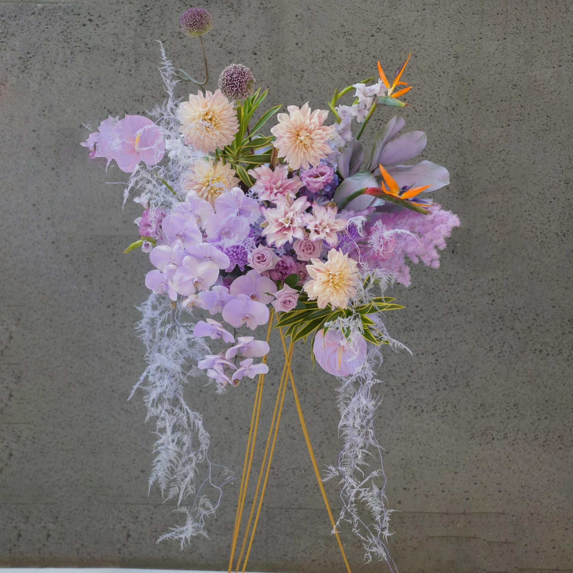蝴蝶兰,重瓣百合,大丽花,牡丹菊,紫色玫瑰,天堂鸟,红掌,时令配花