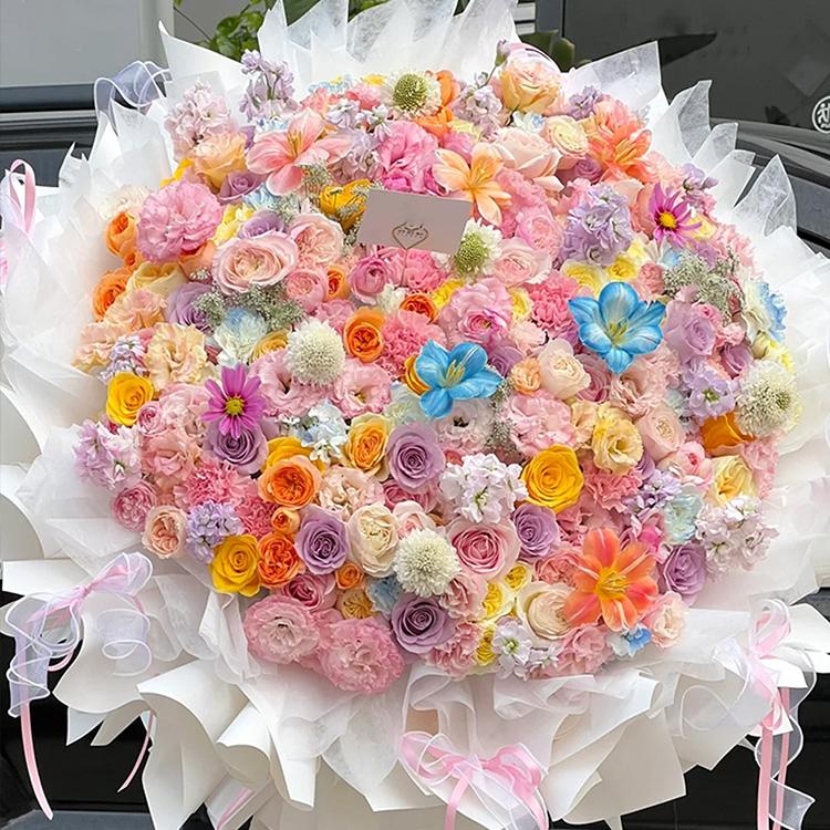粉色玫瑰,紫色玫瑰,橙色玫瑰,康乃馨,桔梗,時令配花
