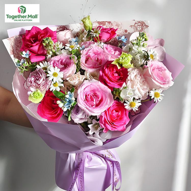 蝴蝶蘭,洛神玫瑰,佛洛依德玫瑰,紫精靈康乃馨,風鈴,時令配花