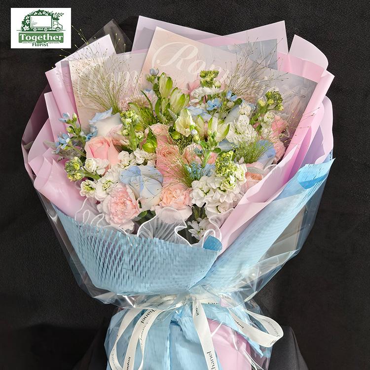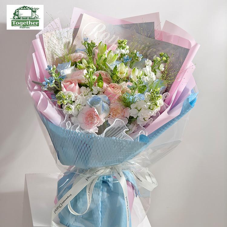 粉雪山玫瑰,碎冰藍玫瑰(噴色),六出花,康乃馨,紫羅蘭,時令配花