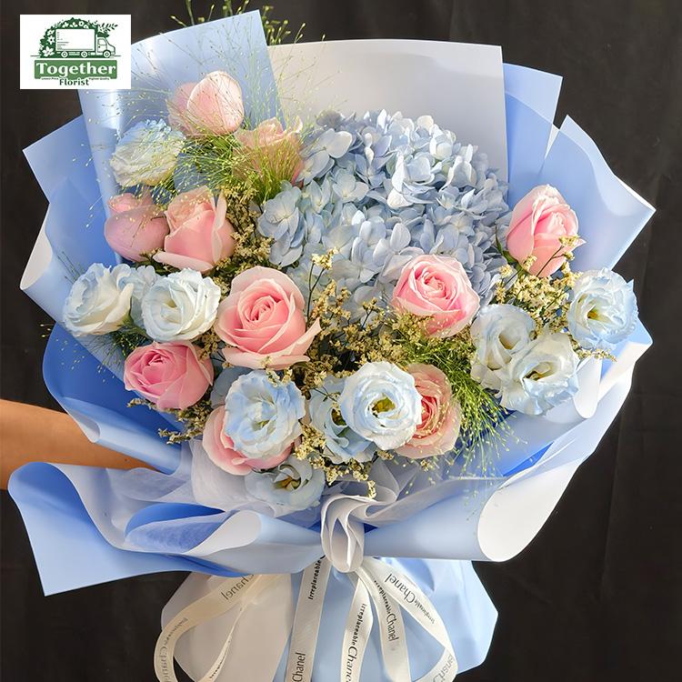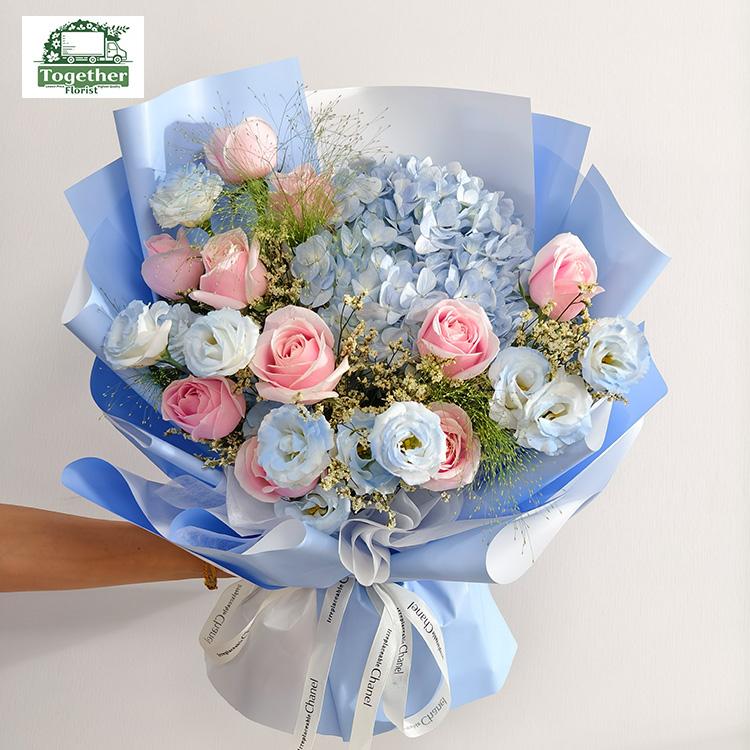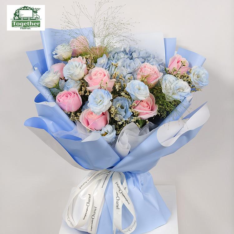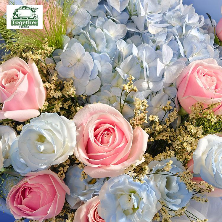 藍色繡球,粉色玫瑰,碎冰藍玫瑰(噴色),臘梅,時令配花
