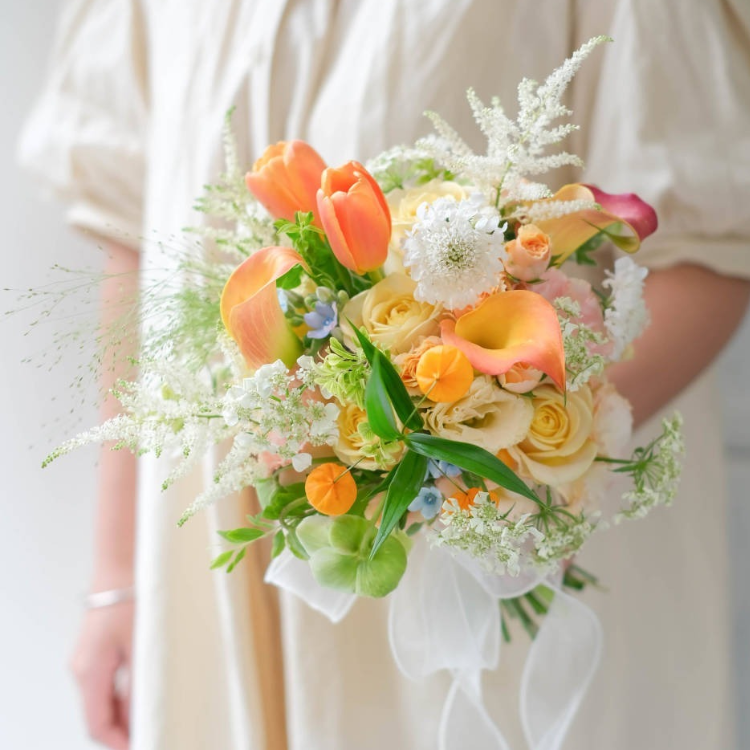 日本宮燈、橙色鬱金香、馬蹄蓮、白色絡新婦、香檳玫瑰、時令配花