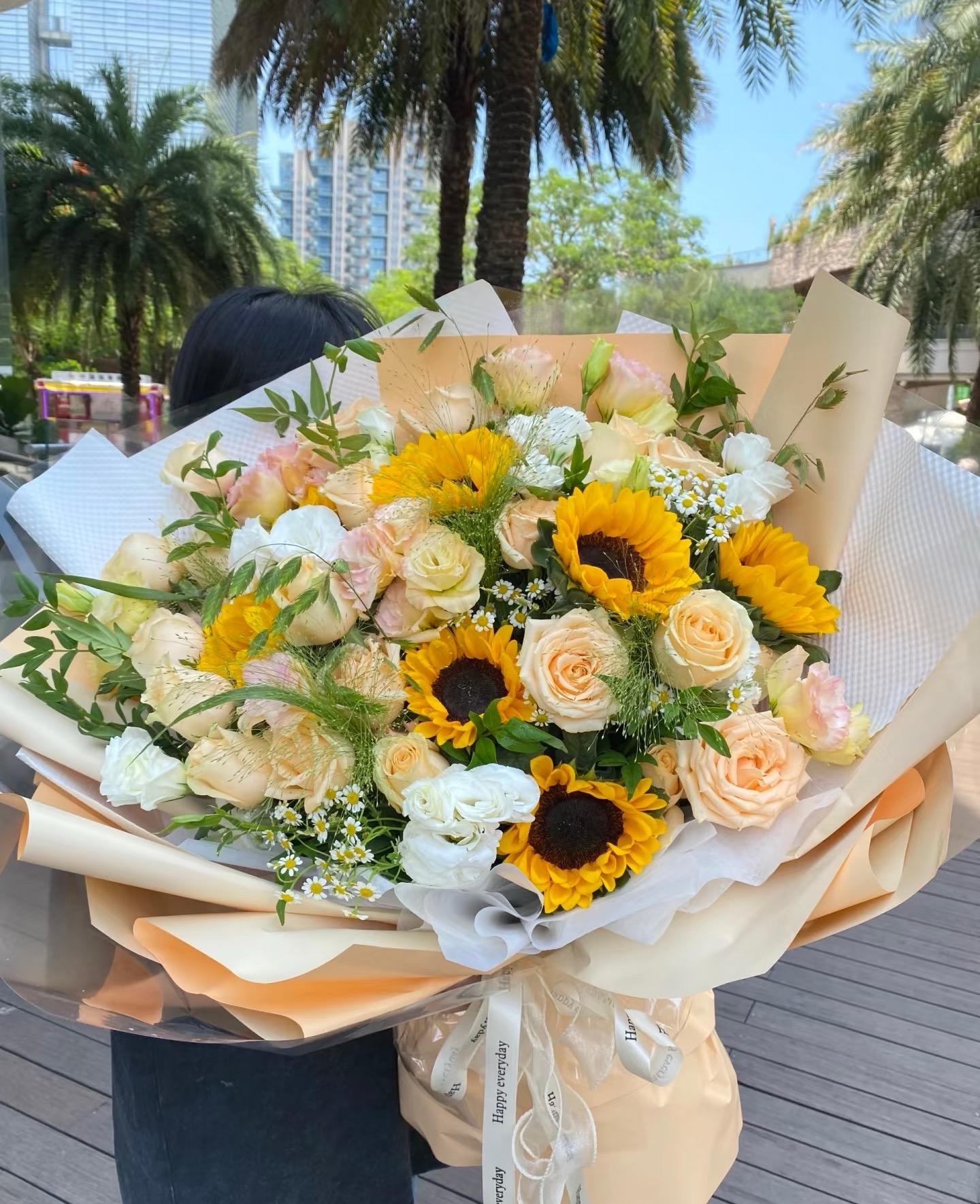 香檳玫瑰、向日葵、桔梗、時令配花