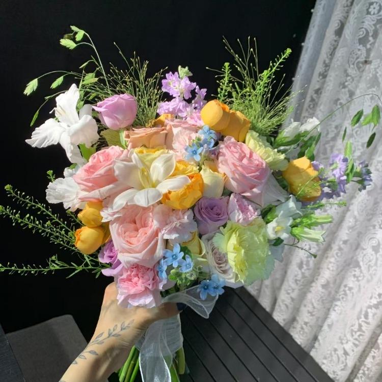 粉色玫瑰,百合,鬱金香,鳶尾,飛燕草,勿忘我,小雛菊,時令配花
