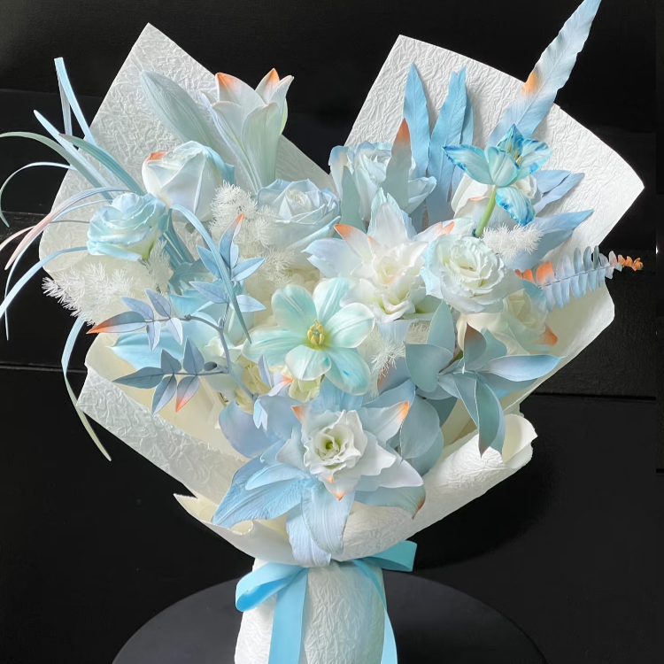 百合、碎冰藍玫瑰(噴色)、鬱金香、時令配花