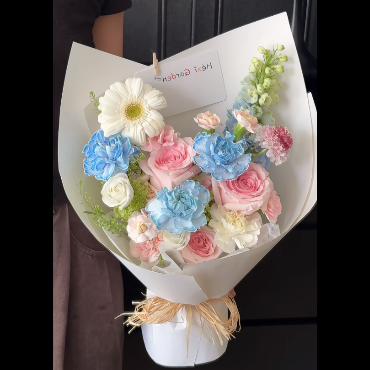 粉色玫瑰、藍色康乃馨、非洲菊、大飛燕、松蟲草、時令配花